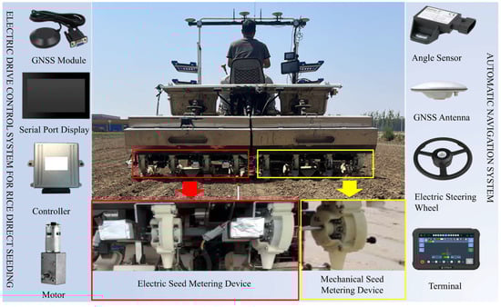 All field experiments in this study were conducted at the National Precision Agriculture Research and Demonstration Base in Xiaotangshan Town, Changping District, Beijing, from June 2023 to August 2024. Since this study involved a large number of experimental indicators to be explored and a large amount of data to be measured, a large number of field experiments were needed, which resulted in a relatively long overall experimental cycle. This study aimed to investigate the performance of the newly designed electric-driven seed metering device. To accelerate the R&D progress of the seed metering device, the field test platform was modified based on existing equipment rather than designing an entirely new machine structure. The designed electric-driven seed metering device was retrofitted onto the existing equipment, with the complete machine powered by a Xingyueshen 2ZG-8Q2 (8s2, Xingyue Group Co., ltd., Jinhua, China) high-speed riding-type transplanter. The test setup is shown in Figure 5. To facilitate comparative performance research between mechanical and electric-driven seed metering devices during field tests, both types of devices were installed simultaneously during the mounting process.