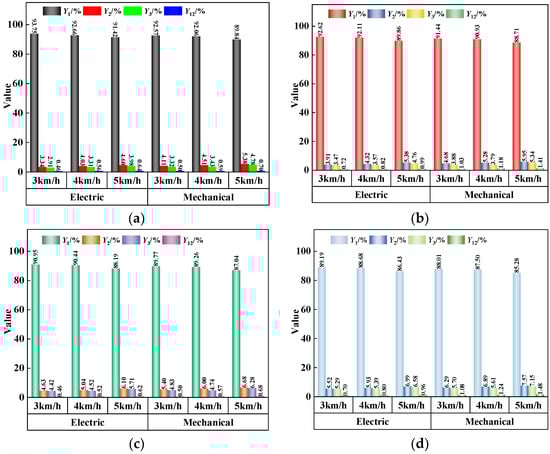 The field hill direct-seeding performance evaluation aims to investigate the seeding effect of the seed metering device when sowing different rice seeds at different vehicle speeds, with the qualified rate, missed seeding rate, repeated seeding rate of seeds per hill, and seed damage rate as evaluation indicators. The test results are shown in Figure 6. It can be seen from the data analysis in the figure that when the vehicle speed was 3–5 km/h, the qualified rate of seeds per hill was 85.28–93.75%, with an average of 89.95%; the missed seeding rate of seeds per hill was 3.34–7.57%, with an average of 5.36%; the repeated seeding rate of seeds per hill was 2.91–7.15%, with an average of 4.69%; the damage rate was 0.46–1.48%, with an average of 0.79%. With the increase in vehicle speed, the seeding performance of the seed metering device decreases, which is consistent with the trend change of the previous simulation study [12].