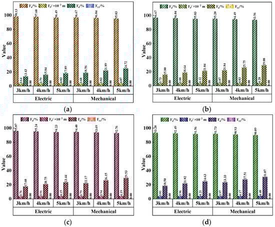 The evaluation of hole formation performance aims to investigate the seeding effect of the seed metering device when sowing different rice seeds at varying vehicle speeds. Evaluation indicators include the qualified rate of hill diameter, average hill diameter, coefficient of variation of hill diameter, and empty hill rate; test results are shown in Figure 7.