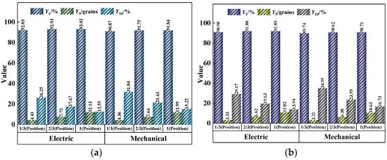 When the adjustment mechanism was set at different positions, the qualified rate of seeds per hill, average number of seeds per hill, and coefficient of variation of seeds per hill for electric drive (mechanical drive) were 90.54% (89.36%), 6.52 (6.43), and 21.98% (25.34%), respectively. Compared with the mechanical drive mode, the electric drive mode increased the qualified rate of seeds per hill by 1.17 percentage points, increased the average number of seeds per hill by 0.09, and decreased the coefficient of variation of seeds per hill by 3.36 percentage points. The accuracy of the adjustment mechanism under the electric drive mode was better than that under the mechanical drive mode, especially in reducing the coefficient of variation of seeds per hill. When the adjustment mechanism was set at different positions, the qualified rate of seeds per hill, average number of seeds per hill, and coefficient of variation of seeds per hill for dry rice seeds (chitting treatment) were 90.67% (89.23%), 6.83 (6.11), and 22.71% (24.61%), respectively. Compared with the dry rice seeds, sowing chitting treatment seeds reduced the qualified rate of seeds per hill by 1.44 percentage points, reduced the average number of seeds per hill by 0.72, and increased the coefficient of variation of seeds per hill by 1.90 percentage points, mainly because the chitting treatment seeds had higher moisture content and poor fluidity, which was not conducive to the seeds entering the cell. Further analysis revealed that the seed metering device in this study met the precision seeding requirements for both conventional rice (2–12 seeds) and hybrid rice (2–9 seeds).