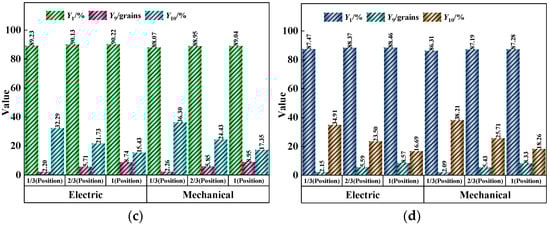 Analysis of the data in the figure shows that when the theoretical hill spacing was 0.15–0.25 m, the average hill spacing ranged from 0.1452 to 0.2487 m, with an average of 0.1976 m; the coefficient of variation of hill spacing was 6.37–15.79%, with an average of 10.21%. The coefficient of variation of hill spacing decreased with the increase in seed sphericity, mainly because seeds with higher sphericity were more likely to enter the metering holes and move smoothly, consistent with the results of previous simulation tests. When the theoretical hill spacing was 0.15–0.25 m, the average hill spacing and coefficient of variation of hill spacing for electric drive (mechanical drive) were 0.1892 m (0.2060 m) and 9.56% (10.86%), respectively. Compared with the mechanical drive mode, the electric drive mode reduced the average hill spacing by 0.0168 m and the coefficient of variation of hill spacing by 1.30 percentage points, indicating better seeding uniformity. When the theoretical hill spacing was 0.15–0.25 m, the average hill spacing and coefficient of variation of hill spacing for dry rice seeds (chitting treatment) were 0.1802 m (0.2145 m) and 9.09% (11.33%), respectively. Compared with the dry rice seeds, sowing chitting treatment seeds increased the average hill spacing by 0.0337 m and the coefficient of variation of hill spacing by 2.24 percentage points. According to the analysis of comprehensive performance evaluation test results, the seed metering device designed in this study performed well in field seeding performance, hole formation performance, and seeding uniformity. Meanwhile, the adjustment mechanism had high precision, and all indicators exceeded the national standards, as well as the test results of existing seed metering devices under the same conditions [30,31,32,33,34]. The seed metering device had good comprehensive performance and met the requirements for precision hill direct seeding of rice.