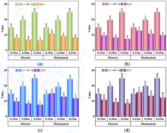 Data analysis showed that at vehicle speeds of 3–5 km/h, the qualified rate of hill diameter ranged from 90.09% to 98.13%, with an average of 94.46%; the average hill diameter was 0.0364–0.0448 m, with an average of 0.0397 m; and the coefficient of variation of hill diameter was 13.43–31.07%, with an average of 22.12%. The empty hill rate was 0% under all test conditions, indicating the excellent hole formation performance of the device. Its hole formation performance decreased with increasing vehicle speed, consistent with the trend observed in single-factor simulation studies mentioned earlier [12]. At vehicle speeds of 3–5 km/h, the electric drive mode achieved a hill diameter qualified rate of 95.21%, an average hill diameter of 0.0392 m, and a coefficient of variation of hill diameter of 19.11%. In contrast, the mechanical drive mode showed 93.72%, 0.0403 m, and 25.13%, respectively. Compared with the mechanical drive mode, the electric drive mode improved the hill diameter qualified rate by 1.5 percentage points, reduced the average hill diameter by 0.0011 m, and decreased the coefficient of variation of hill diameter by 6.02 percentage points, demonstrating superior hole formation performance, particularly in hill diameter uniformity. At vehicle speeds of 3–5 km/h, dry rice seeds had a hill diameter qualified rate of 95.51%, an average hill diameter of 0.039 m, and a coefficient of variation of hill diameter of 21.00%. At the same time, the chitting treatment showed 93.42%, 0.0404 m, and 23.35% increases, respectively. Compared with dry rice seeds, chitting treatment reduced the hill diameter qualified rate by 2.11 percentage points, increased the average hill diameter by 0.0014 m, and raised the coefficient of variation of hill diameter by 2.25 percentage points.