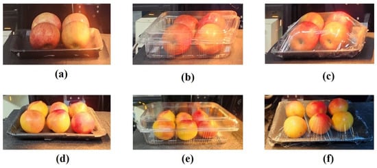 Preparation of apple and plum samples: non-packaged (a,d), polyethylene terephthalate (b,e), and plastic wrap (c,f), respectively.