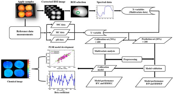 Therefore, the current study intends to integrate HSI and chemometrics for assessing the internal quality of both packaged and non-packaged fresh fruits. By addressing the challenges associated with spectral interference from packaging materials, this research suggests an approach to investigate the feasibility of using HSI combined with chemometrics in order to (1) predict the internal quality parameters, specifically the soluble solid content (SSC), moisture content (MC), and pH of packaged and non-packaged apples and plums; (2) use the visible–near-infrared (Vis-NIR) and short-wave infrared (SWIR) HSI systems to scan fruit inside the packaging (PW and PET) and in a non-packaged (NP) environment; and (3) build the PLSR model for all sample groups (PW, PET, and NP) after spectral data acquisition.
