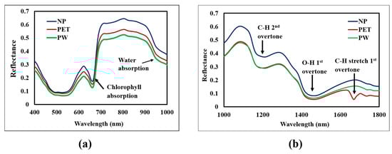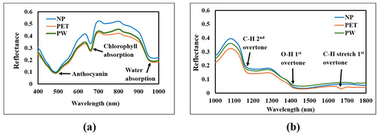 The mean spectral data of apples and plums for the NP, PET, and PW groups based on the Vis-NIR and SWIR regions are presented. The Vis-NIR spectra for NP, PET, and PW for apples Figure 3a and plums Figure 4a shows similar peaks between 650–700 nm and 950–980 nm, corresponding to chlorophyll pigment absorption [47] and the integration of O-H bands with absorption of water [48,49], respectively. Unlike in apples, the peak between 450 and 500 nm was clearly seen in plums, which is attributed to the presence of anthocyanin pigments in this fruit [50]. The packages (PET and PW) are constructed using transparent polymers which influence the limited spectral features observed in the Vis-NIR range, making it difficult to distinguish them from NP. In contrast, SWIR, which has a wider wavelength range and greater penetration depth, is suitable for analyzing heterogeneous samples [51]. For apples Figure 3b and plums Figure 4b, SWIR spectra show similar absorption peaks between 1100–1200 nm and 1400–1500 nm, due to the C-H 2nd overtone and vibration of the O-H 1st overtone, respectively [27]. The low reflectance peak of the PET packaging was noticeable at 1650–1700 nm which could be attributed to the C-H stretch’s 1st overtone [51,52]. The molecular formula of the PET plastic polymer which is made of a chain of ester (C = O) groups, C-H stretching, and deformation of CH in the aromatic ring was also reported [53].