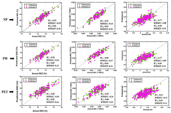 PLSR model development plots of predicted against actual values of plum fruit quality attributes (SSC, MC, and pH) for NP, PW, and PET in Vis-NIR range (400–1000 nm).