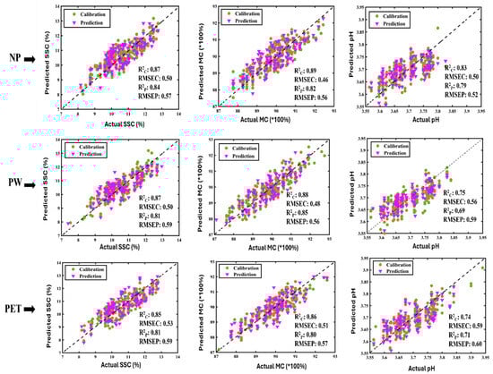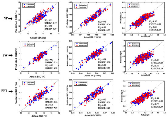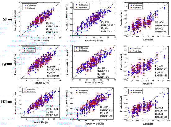 PLSR model development plots of predicted against actual values of apple fruit quality attributes (SSC, MC, and pH) for NP, PW, and PET in Vis-NIR range (400–1000 nm).
