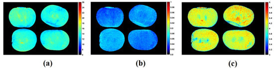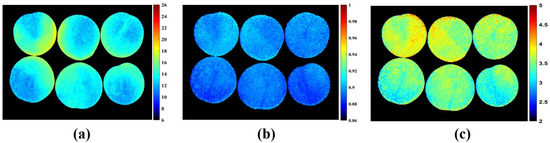 Chemical image visualization for plum. (a) SSC, (b) MC, and (c) pH.