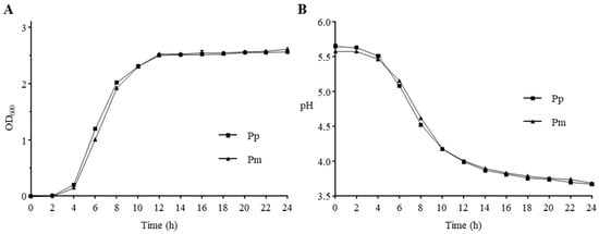 Growth and acid production curves of P. pentosaceus from two sources. (A) Growth curve; (B) Acid production curve. Pm: P. pentosaceus isolated from mulberry leaves; Pp: P. pentosaceus isolated from paper mulberry leaves.