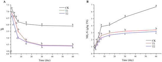 Changes in pH and NH3-N content of mulberry leaves during silage. (A) pH values; (B) NH3-N concentrations. NH3-N, ammonia-N. T1 group, fermented by exogenous P. pentosaceus; T2 group, fermented by epiphytic P. pentosaceus; CK group, control group, fermented by equal amount of sterile water. Values with different little letters show significant differences among treatments in the same ensiling day (p < 0.05).