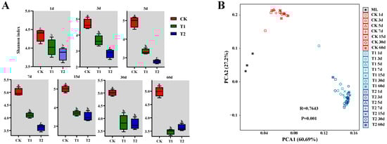 Microbial diversity of mulberry leaves silage. (A) principal component analysis (PCA) of bacterial communities in mulberry leaf silage with different kinds of LAB; (B) alpha diversity of bacterial communities in mulberry leaf silage with different kinds of LAB. ML, fresh mulberry leaves before ensiling; T1 group, fermented by exogenous P. pentosaceus; T2 group, fermented by epiphytic P. pentosaceus; CK group, control group, fermented by equal amount of sterile water. Values with different capital letters show significant differences among treatments in the same ensiling day (p < 0.05).