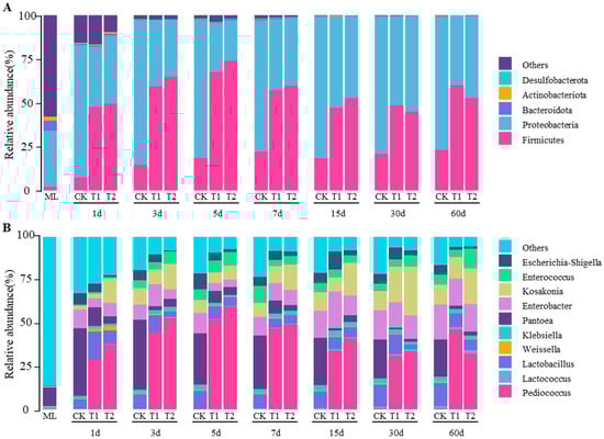 Relative abundance of bacterial communities at the phylum and genus level. (A) the phylum-level relative abundance of bacterial communities; (B) the genus-level relative abundance of bacterial communities. ML, fresh mulberry leaves before ensiling; T1 group, fermented by exogenous P. pentosaceus; T2 group, fermented by epiphytic P. pentosaceus; CK group, control group, fermented by equal amount of sterile water.