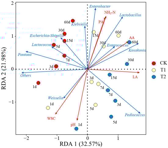 Redundancy analysis (RDA) was used to evaluate the relationship between fermentation characteristics and bacterial communities; the result is shown in Figure 5. The eigenvalues of the first two canonical axes in the RDA explained 32.57% and 21.98%, respectively. LA, AA, NH3-N, PA, WSC, and pH were positively correlated with the first canonical axis (RAD1), while WSC and pH were negatively correlated with the RAD1. At the initial stage of ensiling (1 day), the bacterial communities in each group had a negative correlation with WSC and pH, with Weissella being the main influencing factor. In the early stage of ensiling (3 to 15 days), the bacterial communities had a positive correlation with LA in the T1 and T2 groups, with a greater impact on LA in the T2 group compared to the T1 group, and with Pediococcus being the main influencing factor. In the middle and late stages of ensiling (30 and 60 days), the bacterial communities mainly influenced AA, NH3-N, and PA, with Enterobacter, Lactobacillus, Kosakonia, and Enterococcus being the main factors. In the CK group, the impact of the dominant bacterial communities on the fermentation characteristics of mulberry leaves ensiled from 3 to 60 days was significantly different from that in the T1 and T2 groups. This was mainly reflected in the correlation of Lactococcus, Escherichia-Shigella, and Klebsiella with NH3-N and PA, with Escherichia-Shigella being negatively correlated with Pediococcus.