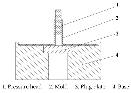 A feed molding test device (Figure 1) is composed of a pressure head, a mold (inner diameter: 20 mm, height: 103.5 mm), a plug plate, a base, etc. The pressure head is connected to a microcomputer-controlled electronic universal testing machine (model: WDW-200, Jinan Shijin Group Co., Ltd., Jinan, China). In the forming process, feeds were added to the mold, and then the universal testing machine was started and operated at a rate of 100 mm/min. When the preset displacement was reached, it was held for 30 s [26]. Then the plug plate was rapidly removed manually, and the formed pellets were pushed out at the rate of 180 mm/min. Finally, the indenter returned to the initial position.