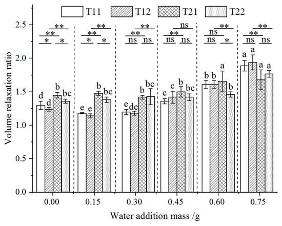 Effect of water addition mass on volume relaxation ratio. T11 and T12 represent the 2 mm corn stover with compression displacements of 90 and 92 mm, respectively; T21 and T22 represent the 4 mm corn stover with compression displacements of 90 and 92 mm, respectively. Under the same straw particle size and compression displacement, a significant difference (p < 0.05) was observed in the average volume relaxation ratio of feed pellets with different water addition masses, as indicated by different lowercase letters. The symbols * and ns above the short horizontal line indicate that there is a significant difference (p < 0.05) and no significant difference (p > 0.05), respectively, in the average volume relaxation ratio of feed pellets under different compression displacements for the same water addition mass and straw particle size. The symbols ** and ns above the long horizontal line indicate that there is a significant difference (p < 0.05) and no significant difference (p > 0.05), respectively, in the average volume relaxation ratio of feed pellets under different straw particle sizes with the same added mass of water and compression displacement.