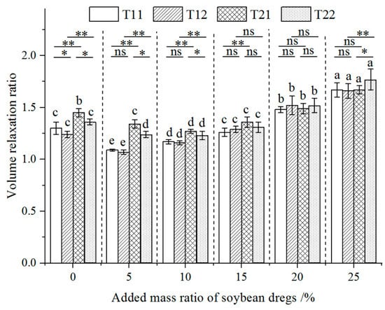 Effect of added mass ratio of fermented soybean dregs on volume relaxation ratio. T11 and T12 represent the 2 mm corn stover with compression displacements of 90 and 92 mm, respectively; T21 and T22 represent the 4 mm corn stover with compression displacements of 90 and 92 mm, respectively. Under the same straw particle size and compression displacement, a significant difference (p < 0.05) was observed in the average volume relaxation ratio of feed pellets with different added mass ratios of fermented soybean dregs, as indicated by different lowercase letters. The symbols * and ns above the short horizontal line indicate that there is a significant difference (p < 0.05) and no significant difference (p > 0.05), respectively, in the average volume relaxation ratio of feed pellets under different compression displacements for the same added mass ratio of fermented soybean dregs and the same straw particle size. The symbols ** and ns above the long horizontal line indicate that there is a significant difference (p < 0.05) and no significant difference (p > 0.05), respectively, in the average volume relaxation ratio of feed pellets under different straw particle sizes with the same added mass ratio of fermented soybean dregs and the same compression displacement.