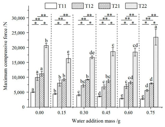 Effect of water addition mass on maximum compressive force of straws. T11 and T12 represent the 2 mm corn stover with compression displacements of 90 and 92 mm, respectively; T21 and T22 represent the 4 mm corn stover with compression displacements of 90 and 92 mm, respectively. Under the same straw particle size and compression displacement, a significant difference (p < 0.05) was observed in the average maximum compressive force of feeds with different water addition masses, as indicated by different lowercase letters. The symbol * above the short horizontal line indicates that there is a significant difference (p < 0.05) in the average maximum compressive force of feeds under different compression displacements for the same water addition mass and straw particle size. The symbol ** above the long horizontal line indicates that there is a significant difference (p < 0.05) in the average maximum compressive force of feed under different straw particle sizes with the same added mass of water and compression displacement.