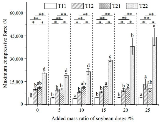 Effect of added mass ratio of fermented soybean dregs on maximum compressive force of straws. T11 and T12 represent the 2 mm corn stover with compression displacements of 90 and 92 mm, respectively; T21 and T22 represent the 4 mm corn stover with compression displacements of 90 and 92 mm, respectively. Under the same straw particle size and compression displacement, a significant difference (p < 0.05) was observed in the average maximum compressive force of feeds with different added mass ratios of fermented soybean dregs, as indicated by different lowercase letters. The symbol * above the short horizontal line indicates that there is a significant difference (p < 0.05) in the average maximum compressive force of feeds under different compression displacements for the same added mass ratio of fermented soybean dregs and the same straw particle size. The symbol ** above the long horizontal line indicates that there is a significant difference (p < 0.05) in the average maximum compressive force of feeds under different straw particle sizes with the same added mass ratio of fermented soybean dregs and the same compression displacement.