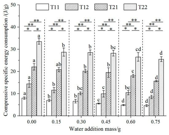 Effect of moisture on compressive specific energy consumption of straw densification. T11 and T12 represent the 2 mm corn stover with compression displacements of 90 and 92 mm, respectively; T21 and T22 represent the 4 mm corn stover with compression displacements of 90 and 92 mm, respectively. Under the same straw particle size and compression displacement, a significant difference (p < 0.05) was observed in the average compressive specific energy consumption of feeds with different water addition masses, as indicated by different lowercase letters. The symbol * above the short horizontal line indicates that there is a significant difference (p < 0.05) in the average compressive specific energy consumption of feeds under different compression displacements for the same water addition mass and straw particle size. The symbol ** above the long horizontal line indicates that there is a significant difference (p < 0.05) in the average compressive specific energy consumption of feeds under different straw particle sizes with the same added mass of water and compression displacement.