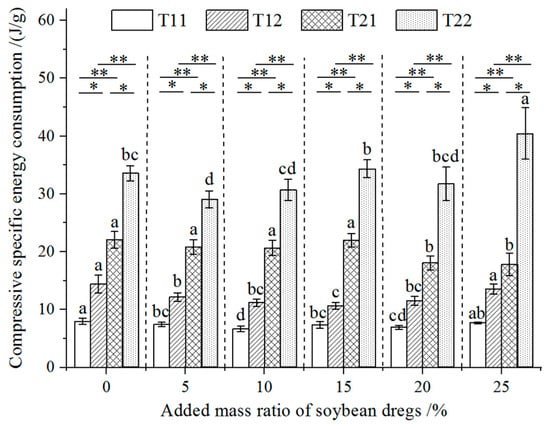 Effect of added mass ratio of fermented soybean dregs on compressive specific energy consumption of feed densification. T11 and T12 represent the 2 mm corn stover with compression displacements of 90 and 92 mm, respectively; T21 and T22 represent the 4 mm corn stover with compression displacements of 90 and 92 mm, respectively. Under the same straw particle size and compression displacement, a significant difference (p < 0.05) was observed in the average compressive specific energy consumption of feeds with different added mass ratios of fermented soybean dregs, as indicated by different lowercase letters. The symbol * above the short horizontal line indicates that there is a significant difference (p < 0.05) in the average compressive specific energy consumption of feeds under different compression displacements for the same added mass ratio of fermented soybean dregs and straw particle size. The symbol ** above the long horizontal line indicates that there is a significant difference (p < 0.05) in the average compressive specific energy consumption of feed under different straw particle sizes with the same added mass ratio of fermented soybean dregs and compression displacement.
