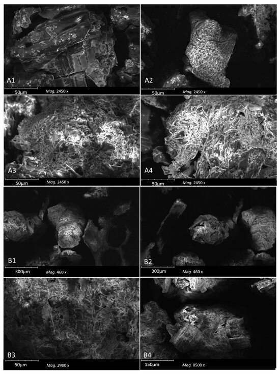 SEM micrographs of UT-TMF samples (A1–A4) and TT-TMF samples (B1–B4), acquired at magnifications ranging from 460× to 2450×. (A1–A4): Fibrous fragments with visible lamellar structures, rough surfaces, and longitudinal channels, typical of partially degraded plant residues from the feeding substrate. In some cases, fibrous elements are embedded within an amorphous matrix. (B1–B4): Compact and amorphous morphology resulting from thermal treatment at 70 °C for 60 min. Micrographs show dense agglomerates, surface wrinkling, and, occasionally, residual lamellar structures partially fused within the organic matrix.