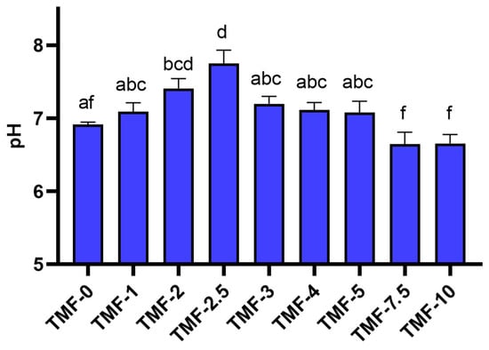 pH of the TMF/soil mixtures with different percentages of TT-TMF. Bars represent mean values ± standard deviation. Different letters above the bars indicate statistically significant differences between treatments (p < 0.05), as determined by Kruskal–Wallis’s test followed by Dunn’s multiple comparison test.