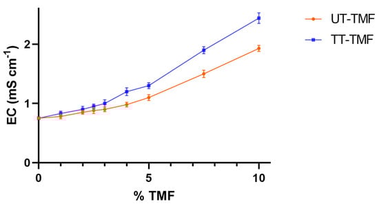 Regarding EC, all the tested substrates (soil and TMF at rates up to 10%) show growing values from 0.75 dS m−1 for 100% soil (from the label) to values of 1.93 ± 0.05 dS m−1 and 2.44 ± 0.09 dS m−1 for the UT-TMF-10 (in orange) and TT-TMF-10 (in blue), respectively (Figure 4). For TMF percentages below 2.5%, the resulting substrate exhibits an EC similar to that of soil alone, for both UT-TMF and TT-TMF. A significant increase in EC is observed at higher percentages.