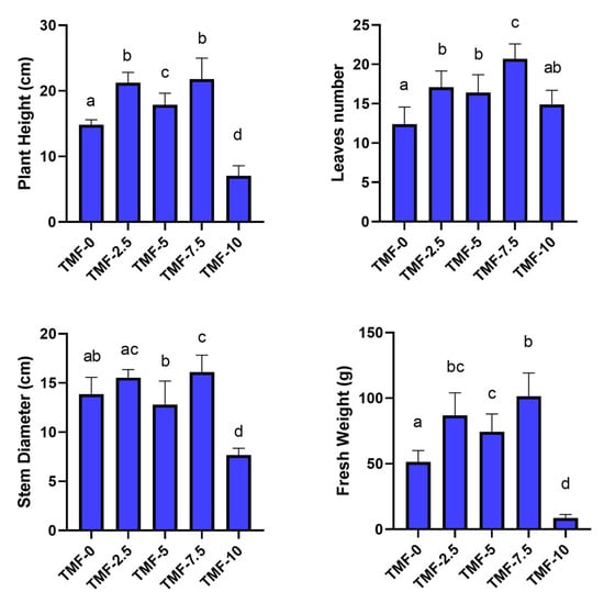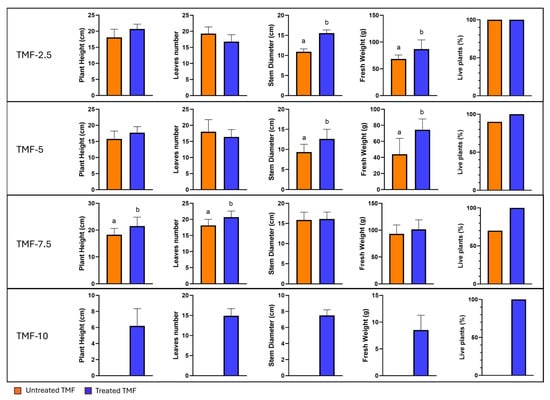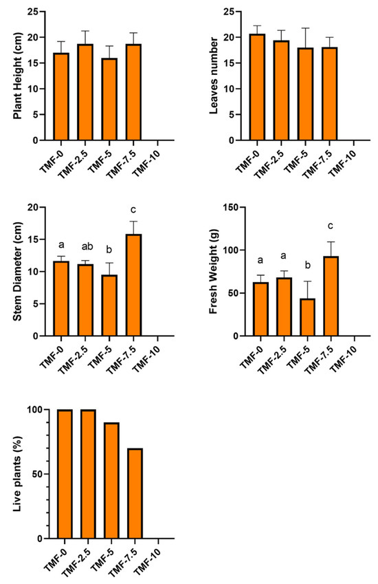 Figure 5 shows the results obtained on canasta plants grown with the addition of UT-TMF (in orange). In the case of TMF-10, no plants survived. Therefore, in addition to the PH, LN, SD, and FW parameters, we also included a parameter indicating live plants to show that, at TMF-10, all ten plants died; at TMF-7.5, three plants died; and at TMF-5, one plant died.