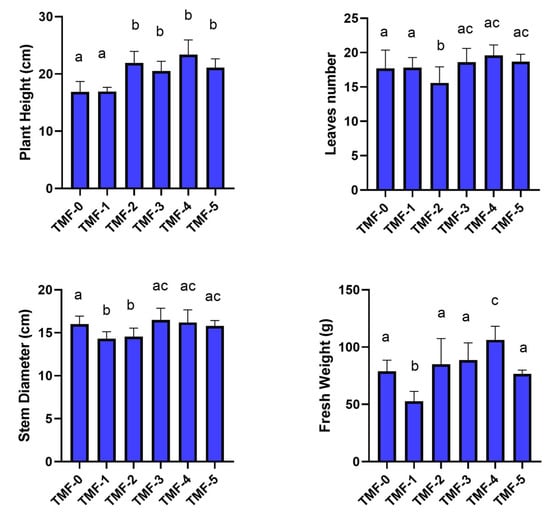 The concentrations tested are within a very narrow range, leading to similar results for almost all parameters. However, some significant differences can be observed. The plant height (PH) is very similar for concentrations of 2% and above, while both the control and TMF-1, comparable to each other, show lower growth. For leaf number (LN), only TMF-2 is significantly lower. When it comes to stem diameter (SD), only TMF-1 and TMF-2 exhibit lower values. The fresh weight in TMF-1 is significantly lower than in the control group, while TMF-4 shows higher values compared to both the control and the other concentrations tested.