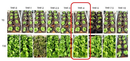Growth of Lactuca sativa var. capitata at different TMF amendment levels (TMF-0, TMF-1, TMF-2, TMF2.5, TMF-3, TMF-4, TMF-5, TMF-7.5, TMF-10, dry weight basis) at day 0 (T0) and after 30 days (T30), by two tests. The 4% TMF treatment showed the best performance in terms of plant development.