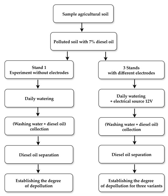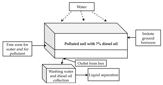 - A pollutant was chosen—diesel oil—for which density and viscosity at various temperatures were determined; these two properties are responsible for the penetration of the pollutant into the soil structure. All physical properties of diesel oil determined in the laboratory (density and viscosity) or that we had available from the source are presented in the paper. In the laboratory, agricultural soil was contaminated with 7% diesel oil, and the sample was placed in a box.