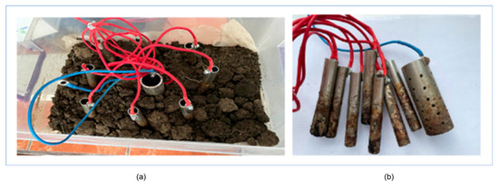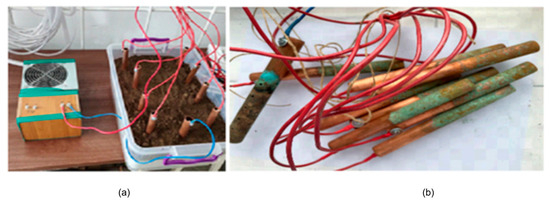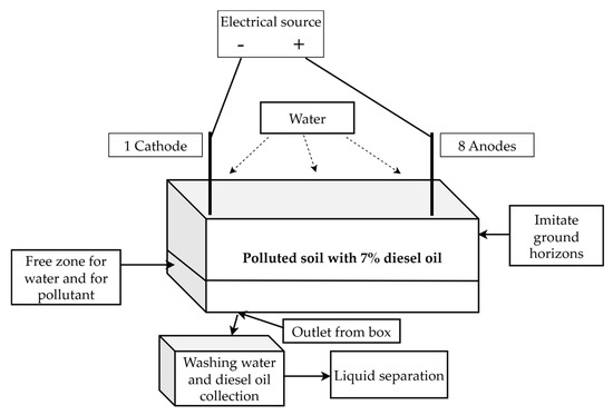 - A plastic box (length 37 cm, width 25 cm, height 15 cm) was chosen in which the following was mounted: a plastic plate with dense and symmetrical holes at 2 cm above the bottom of the box. A layer of gauze (canvas low) was placed to prevent the holes from clogging with solid aggregates of sand and soil. A fine layer of sand, a layer of lightly moistened soil, and then a layer of soil taken directly from the field were placed in the box from bottom to top. Holes were also made at the bottom of the box for the removal of both washing water and pollutants. Holes in the bottom of the vessel were placed in the cathode zone for all experiments, where the hydrocarbons were predominantly directed, but could be placed at any point just for collection, as a rigid plastic plate with holes was placed under the thinnest layer.