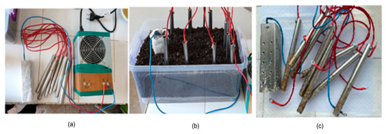 Stainless steel electrodes in working variant 2—electrodes and power source. (a) Electrical source and the electrodes; (b) the box with electrodes; (c) the electrodes after the experiment.