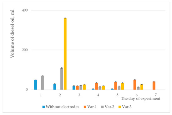 Three experiments with different electrodes were performed on the 7% diesel oil-contaminated sample. All variants have been performed several times. Three replicates of the experiments were performed.