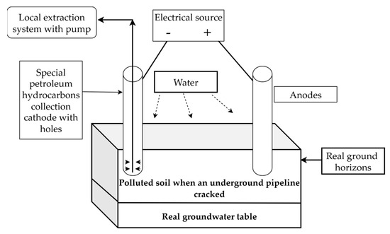 Although it is possible to collect liquid samples from the bottom of the can in the laboratory, this is not possible industrially. Therefore, future efforts will focus on finding a “closed” cathode for pollutant extraction. Figure 9 shows a proposal for an in situ application to limit major, accidentally occurring pollution from the cracking of petroleum product transportation pipelines.