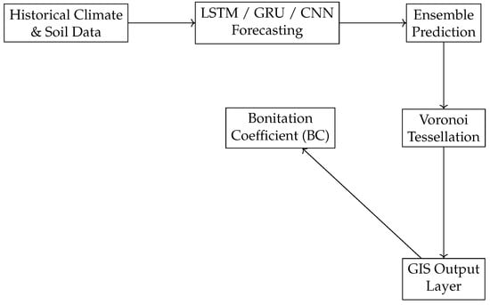 This section details the methodological framework developed for adaptive land bonitation using GIS integration, machine learning forecasting, and spatial interpolation. The overall approach consists of three main phases: (1) computation of the Bonitation Coefficient (BC) using classical and GIS-based inputs, (2) machine learning-based climate prediction to fill data gaps and forecast indicators, and (3) spatial generalization of forecast outputs using Voronoi tessellation to create continuous GIS layers. For the third phase, an influence or contagion algorithm could be used in order to calculate the new GIS layer [31]. The system is designed to accommodate variable data availability and geographic heterogeneity.