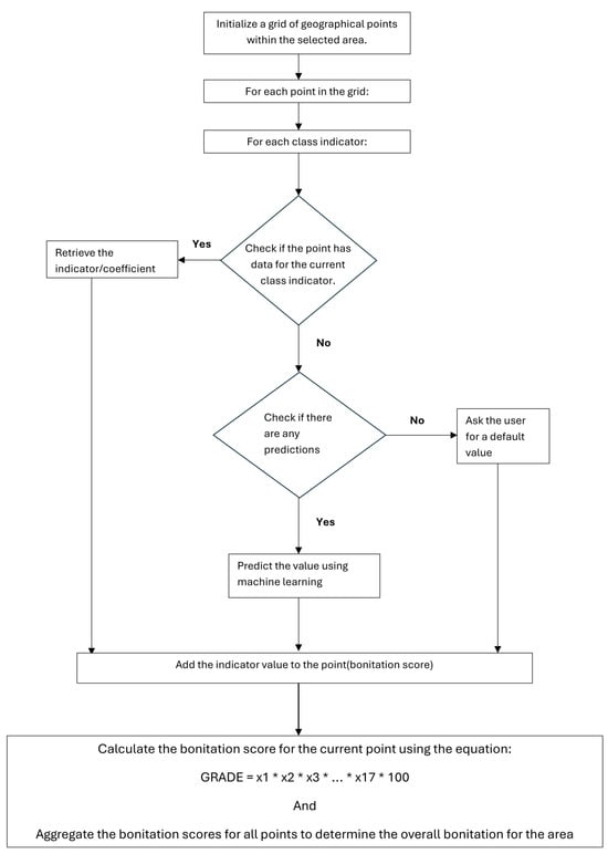 Our proposed algorithm calculates the Bonitation Coefficient (BC) [32] by integrating a set of 17 foundational indicators through GIS layers [35]. The system is designed to handle flexible input formats and allow data flow through multiple pathways depending on the availability and quality of the input data. The geographical space of interest is partitioned using a grid of points. Each GIS point may contain complete, partial, or missing data for any of the 17 bonitation layers (or more if wanted). The user is allowed to select the spatial resolution (e.g., 100 m, 250 m, or 500 m) and the type of workflow to be applied to the space of interest: Model Training, Prediction Integration, or Manual Input. This flexible design makes the system usable across a wide range of conditions, from data-rich regions to sparsely sampled areas. The uniqueness of the research focuses on sparsely sampled locations, where either no data are available or there are historical data but no current data. For the case when there are no data, user input is required, but for the case of historical data, a machine learning framework could be put in place. There is a third case when there are available, ready-made predictions, but this one could be integrated into the manual input workflow.