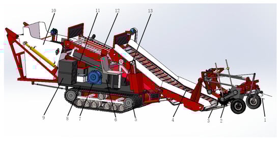 3D Structural schematic of self-propelled potato harvester: 1. Film-collecting device; 2. Depth-limiting soil crushing device; 3. Excavating shovel; 4. Primary potato–soil conveying and separating device; 5. Crawler system; 6. Gearbox; 7. Generator; 8. Sorting platform; 9. Fuel tank; 10. Potato collection box; 11. Diesel engine; 12. Secondary potato–soil conveying and separating device; 13. Hydraulic system.