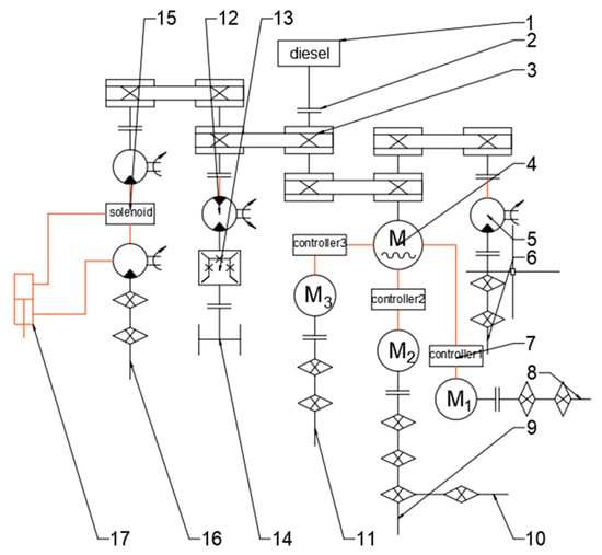 Schematic diagram of the power transmission mode of the potato harvester (the red circuit is electro-hydraulically controlled, and the black circuit is mechanically controlled). 1. Diesel engine; 2. Bearing; 3. Gear and belt drive; 4. Alternating current (AC) generator; 5. Unidirectional hydraulic motor; 6. Power output shaft of primary elevating device; 7. No. 1 current controller; 8. Electric motor; 9. Secondary separation drive shaft; 10. Soil conveyor belt drive shaft; 11. Scraper conveyor belt drive shaft; 12. Bidirectional hydraulic motor; 13. Gearbox; 14. Crawler chassis drive shaft; 15. Solenoid valve; 16. Soil-shaking fork tooth rotating shaft; 17. Hydraulic push rod.