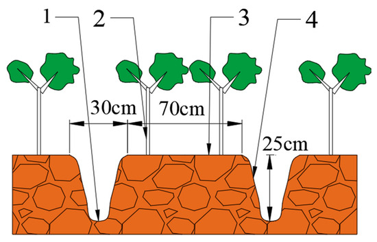 The test site is located in Huangzhong District, Xining City, Qinghai Province, with an altitude ranging from 2225 to 4488 m. The annual average temperature is 5.1 °C. Film-mulching planting of potatoes can effectively reduce surface water evaporation, inhibit weed growth, reduce diseases and pests, and decrease the use of herbicides and insecticides [21]. The combination of full-field film mulching and ridge cultivation technology can intensively utilize resources such as soil, fertilizer, water, light, heat, and gas in farmland. It gives full play to the effects of film mulching cultivation technology in increasing temperature, preserving moisture, promoting early maturity, and increasing yield. The local planting ridges are 70 cm wide, with furrows 30 cm wide and 25 cm deep. The plastic film used is 100 cm wide and 0.01 mm thick. As shown in Figure 3, the row spacing of potato planting is 40–45 cm, the plant spacing is 30 cm, and the planting density is 3500 plants per mu (1 mu ≈ 0.0667 hectare). Rhizosphere fertilization is carried out 15–20 cm under the film.