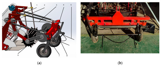 Schematic diagram of the film-collecting device structure. 1. Hydraulic motor; 2. Movable crank; 3. Soil-shaking device connecting rod; 4. Film-stretching roller; 5. Soil-shaking device; 6. Soil-crushing roller; 7. Film-collecting roller; 8. Soil-shaking device swing rod. (a) Structure diagram, (b) Physical picture.