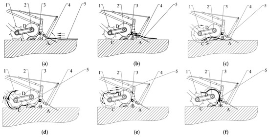 The residual film collection process is illustrated in Figure 5. The arrows indicate the flow direction of residual film, and points A, B, C, and D represent four position points with fixed relative positions to the harvester. In Figure 5a, the surface residual film prior to collection is covered by potato vines and soil. As the harvester moves forward, the soil-shaking device inserts into the ground at a certain angle. Driven by the crank–rocker mechanism, it tilts up and down on the soil surface. At point A, it pulls the residual film out of the compacted soil, separating surface soil and weed stems from the film. As the machine advances, it enters the state depicted in Figure 5b. The residual film reaches point B and passes through the film-unfolding roller. This roller not only initially crushes large surface soil clumps but also flattens the irregularly moving residual film after soil shaking, preventing the accumulation of film, soil, and vines from winding around the machine. When the residual film is transported backward to point C (Figure 5c,d), it passes through and wraps around the soil-crushing roller (which is in direct contact with the ground). The soil-crushing roller, equipped with steel beams of alternating protrusion heights, crushes the soil and catches the flattened residual film from the film-unfolding roller, rolling it up clockwise. As the subsequent residual film moves upward with the soil-crushing roller (Figure 5e,f), it reaches point D. Here, one end of the film contacts the film-winding roller and is rolled up for collection, thus completing the process.