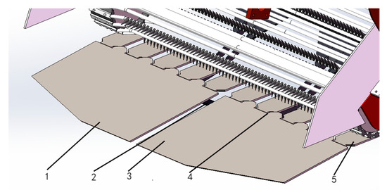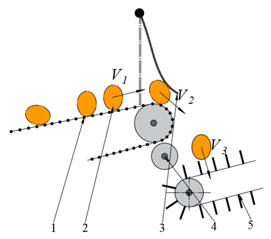 Schematic diagram of the potato movement process. 1. Secondary elevator chain; 2. Potatoes; 3. Buffer curtain; 4. Stem–leaf deflector rod; 5. Scraper conveyor belt.