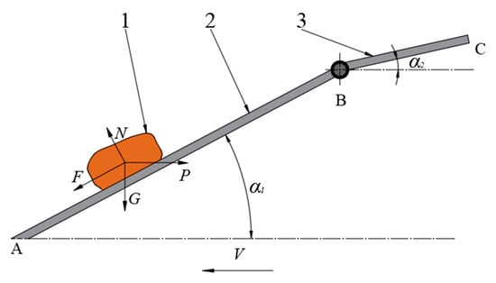 It can be seen from Figure 7 that the digging shovel is a split-type two-stage planar composite structure composed of two planes, AB and BC. Through two groups of different shovel surface angles (α1, α2), it realizes processes such as low-resistance soil penetration, high-performance soil crushing, and excavated material transportation of the excavator. Depending on the excavator movement conditions, the following equation is derived: