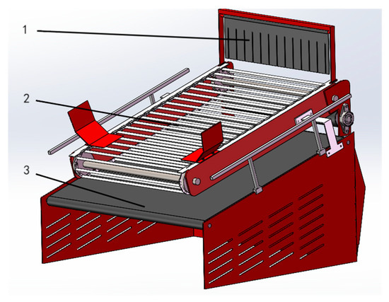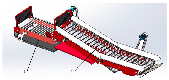 Schematic diagram of the structure of the secondary potato–soil separation device. 1. Buffer curtain; 2. Chain–rod conveyor belt; 3. Soil transfer belt.