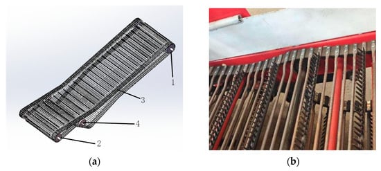 The elevating separation device adopts a rod-type elevating separator. The belt–rod elevator uses a belt as the medium to connect the rods. The rods are installed on the belt to form a conveyor belt. The belt–rod elevator has a large conveying area, suitable for conveying large quantities of materials. In heavy clay soil environments, its stable operation helps avoid material accumulation caused by sudden changes in soil viscosity. Furthermore, as a mature technology, the belt–rod type operates stably and inflicts minimal mechanical damage on potatoes, which is why it is selected as the main conveying and separation device [25].
