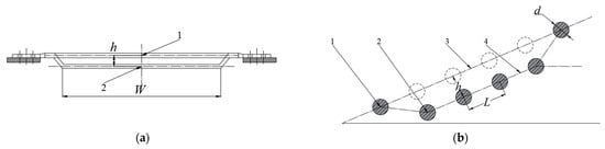 S1, the gap area of the screening plane (plane 3) with all straight bars; L, rod spacing, 45 mm; W, working width of the elevator chain rod, 1000 mm. When the rods are arranged in an alternating pattern of straight and curved rods, the total gap area S2 between six rods in the screening plane is shown in the figure as: