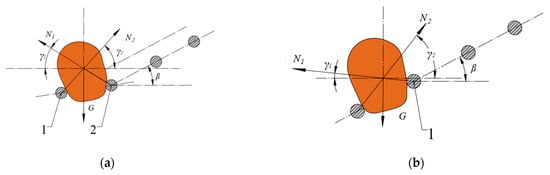 N1 is the support force of the curved rod on the potato tuber; N2 is the support force of the straight rod on the potato tuber; γ1 is the angle between the support force N1 and the horizontal direction; γ2 is the angle between the support force N2 and the horizontal direction; G is the self-gravity of the potato–soil mixture. To prevent backflow of the potato–soil mixture, it needs to have an acceleration moving rearward, that is, the resultant force in the horizontal direction should be: