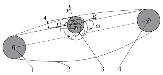 The vibration wheel is designed with a cam structure. As shown in Figure 12, R is the radius of the vibration wheel, and L is the eccentric distance of the vibration wheel. The two vibration wheels are symmetrically installed on the inner side of the frame. An electric motor drives the shaft of the vibration wheel, and the cams come into contact with the screen surface to apply high-frequency low-amplitude vibrations to the separation screen, causing the screen surface to exhibit wavy motion.