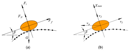 In Formula (10), the following apply: m, mass of the potato–soil mixture, kg; β, working inclination angle of the elevator chain; g, gravitational acceleration, m/s2; Fi, inertial force acting on the potato vertically upward along the chain surface, N. In Figure 13a, FN is the supporting force exerted by the elevator chain on the potato, and Ff is the friction force exerted by the elevator chain on the potato. Since the moment when the potato is just about to leave the elevator chain is considered here, both FN and Ff are 0.